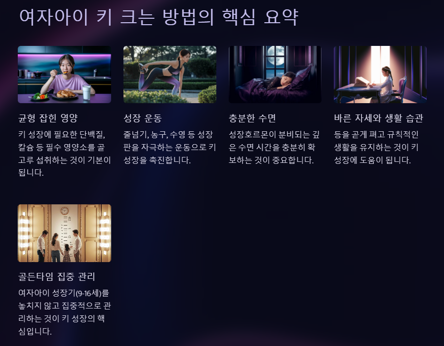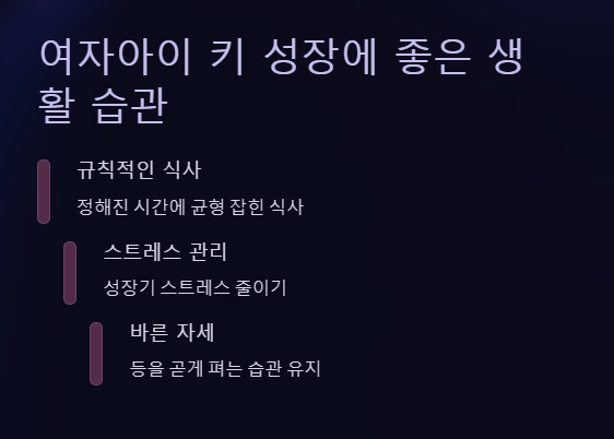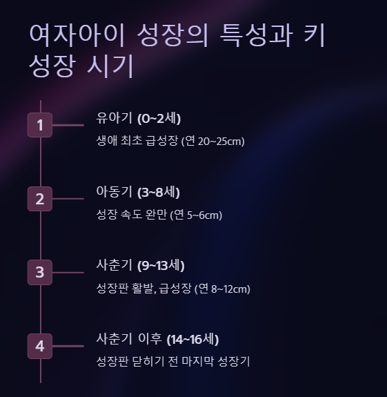✅ 여자아이의 키 성장은 사춘기 이전과 초기에 집중되므로, 이 시기를 놓치지 않는 것이 중요합니다.