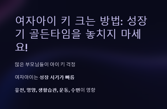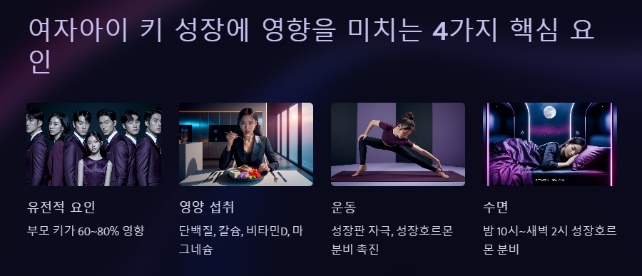 여자아이의 성장에는 유전적 요인뿐만 아니라 영양 섭취, 생활 습관, 운동, 수면 등이 큰 영향을 미치며, 이를 잘 관리하면 키 성장에 긍정적인 변화를 가져올 수 있습니다.
