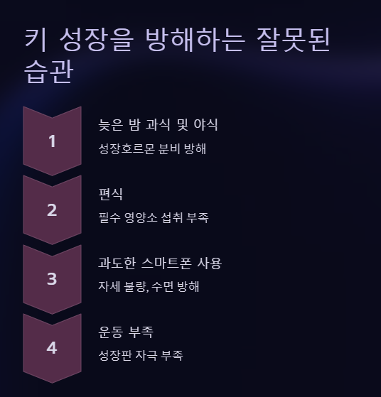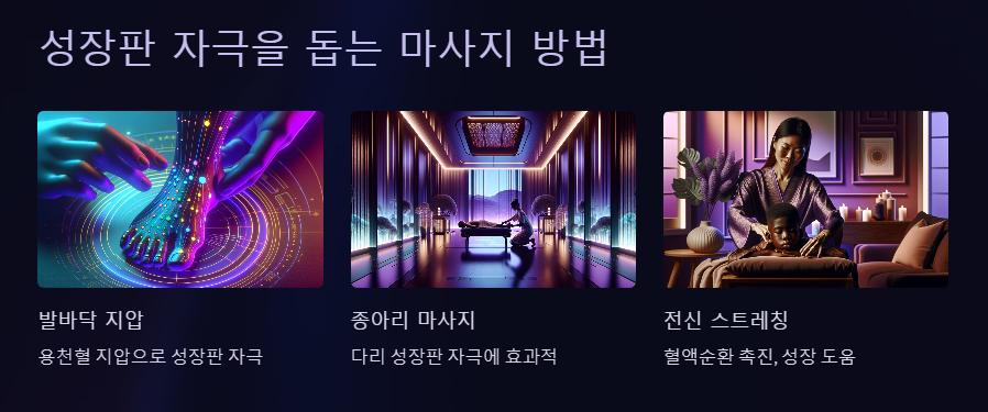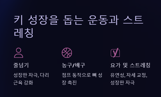 - 성장판을 자극하고 성장 호르몬 분비를 촉진하는 운동이 필수적입니다.