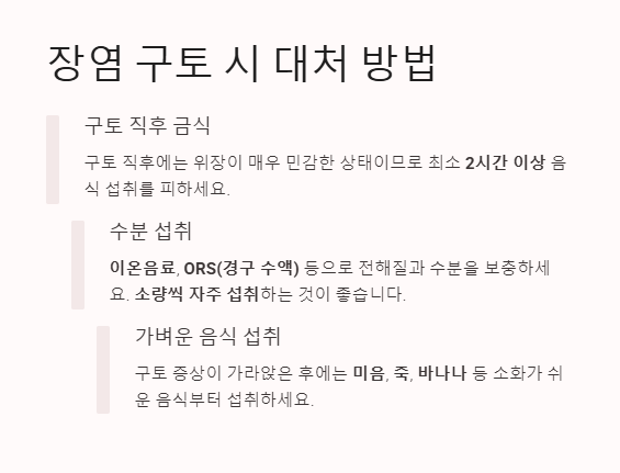 - 구토 직후에는 위장이 매우 민감한 상태이므로 최소 2시간 이상 음식 섭취를 피하세요.