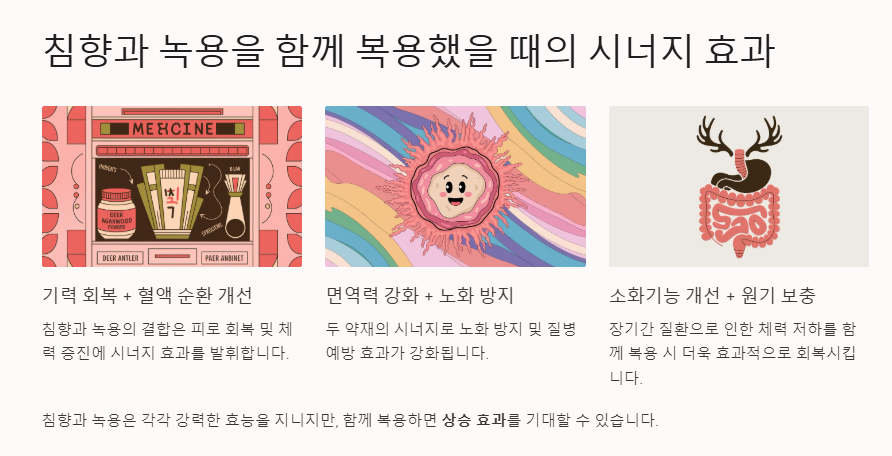 침향과 녹용은 각각 강력한 효능을 지니지만, 함께 복용하면 다음과 같은 상승 효과를 기대할 수 있습니다.